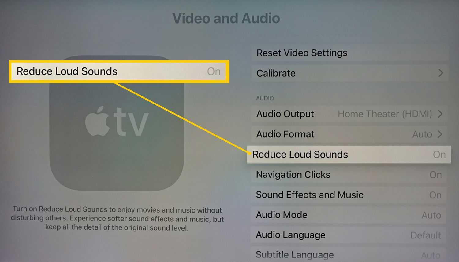 Устройства Apple TV имеют настройку под названием «Уменьшить громкие звуки». Чтобы найти его, выберите « Главное меню» > « Настройки» > « Видео и аудио» > « Уменьшить громкие звуки» (вкл. / Выкл. При необходимости) .