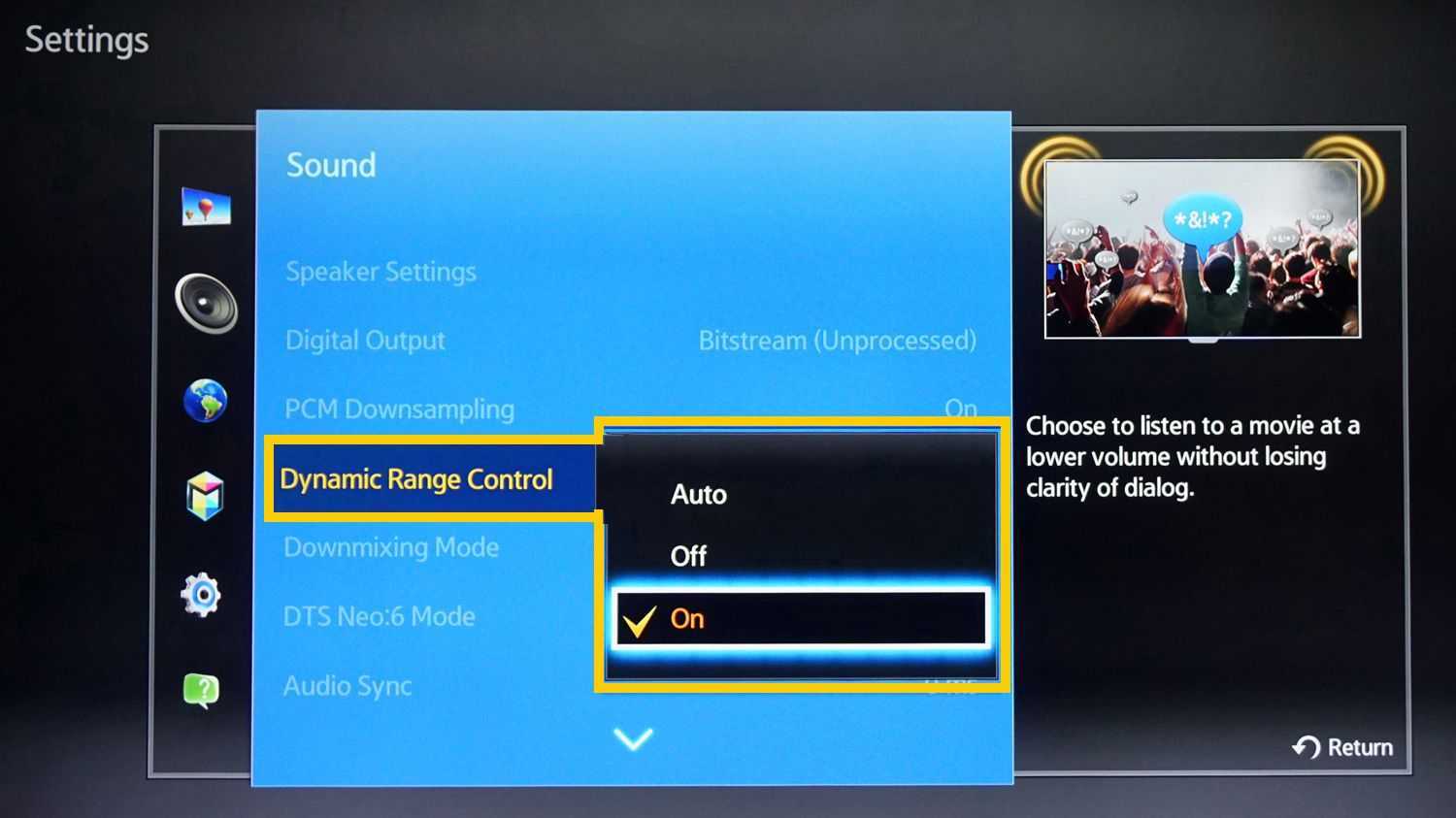 Некоторые проигрыватели Blu-ray / DVD имеют настройку Dialog Enhancement или Dynamic Range Control (DRC) . Вот пример того, что искать в меню настройки звука или звука проигрывателя.