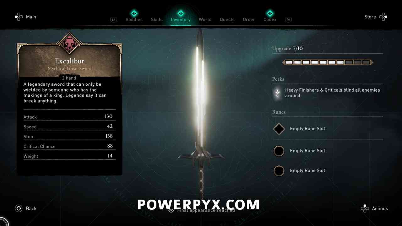 Excalibur is one of the best weapons in the game. Here’s an image of Excalibur and its stats: