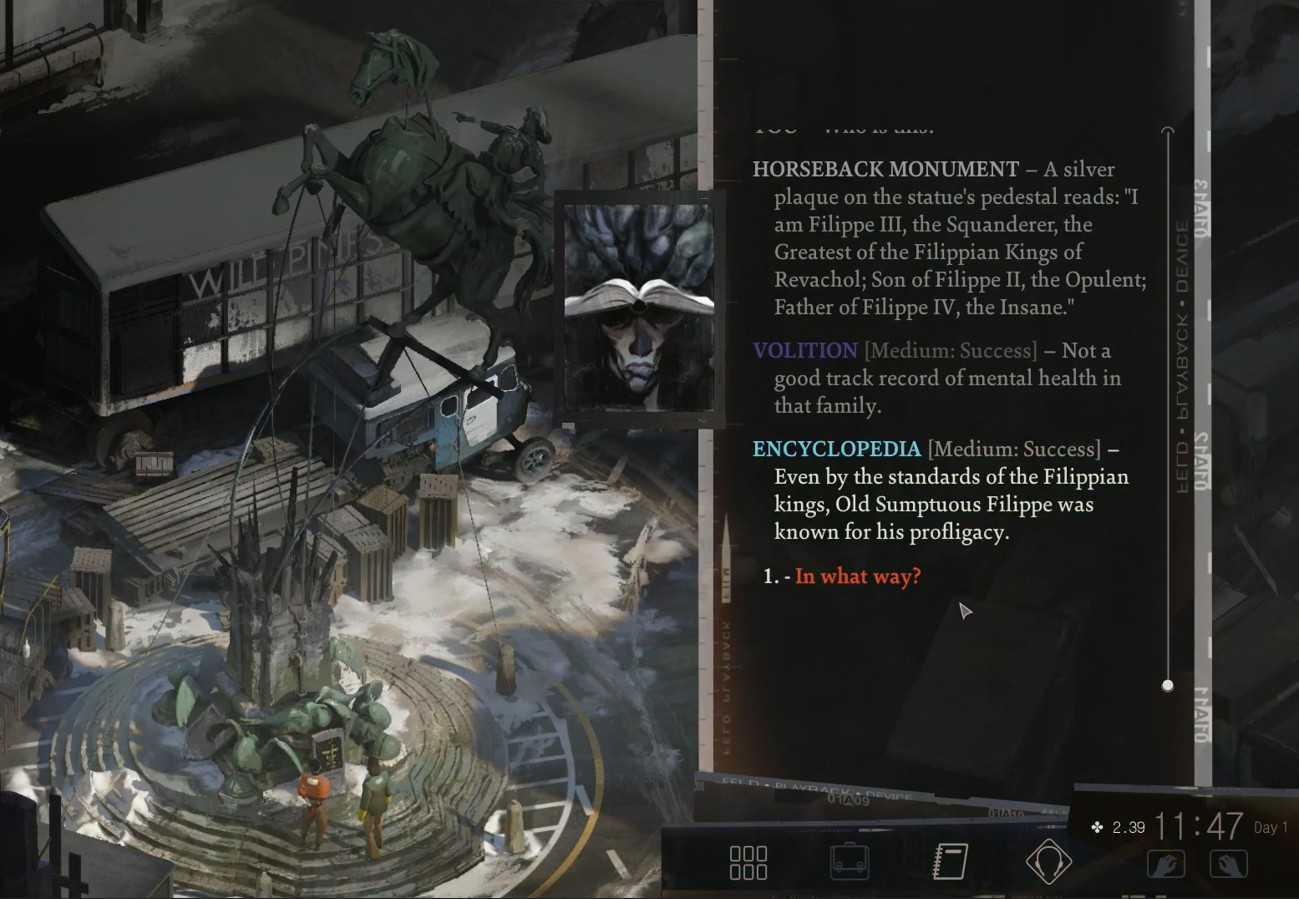 Ограничение по дням в Disco Elysium пугающее. Время пролетает гораздо быстрее, чем ожидаешь. Это может отбить у вас желание заглядывать в каждый уголок игры, который встречается на пути. Подобный подход в корне ошибочен. В Disco Elysium очень редко есть что-то, что в конечном итоге не будет полезным в той или иной степени. Сначала вы можете даже это не осознавать. Поэтому играйте неторопливо и вдумчиво, иначе рискуете потерять львиную долю очарования игры.
