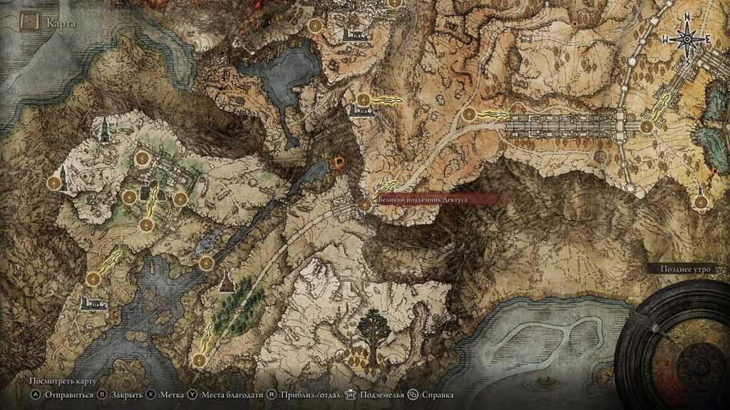Активируйте место благодати «Восточные ворота Райи Лукарии», чтобы открыть возможность для быстрого перемещения в эту локацию. Если продолжите следовать по дороге на север, то найдёте Великий подъёмник Дектуса. Активировать его можно при помощи двух частей медальона.