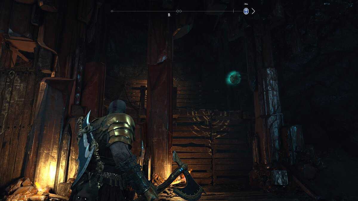 Когда вы пройдете вглубь Звонкого Храма, синие двери перед вами окажутся запертыми. Прежде чем продолжить выполнение сюжетной миссии, поверните направо, и вы увидите ворота с двумя узлами, один из которых держит их закрытыми, а другой висит на потолке. Киньте свой топор и уничтожьте оба узла одновременно.