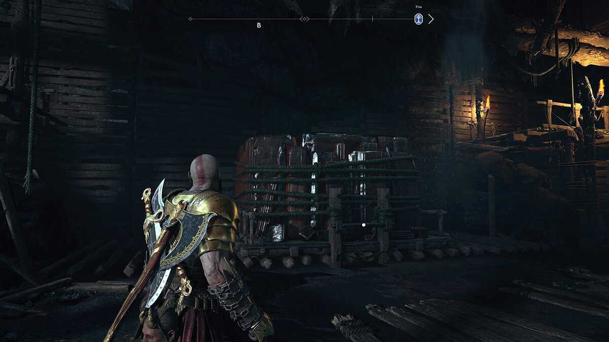Слева от чаши, на потолке, находятся руны, перекрытые деревянной конструкцией, которую можно разрушить, бросив топор. Переключитесь на Атрея, нажмите «квадрат», когда пиктограмма появится на экране, что решит головоломку и откроет сундук.