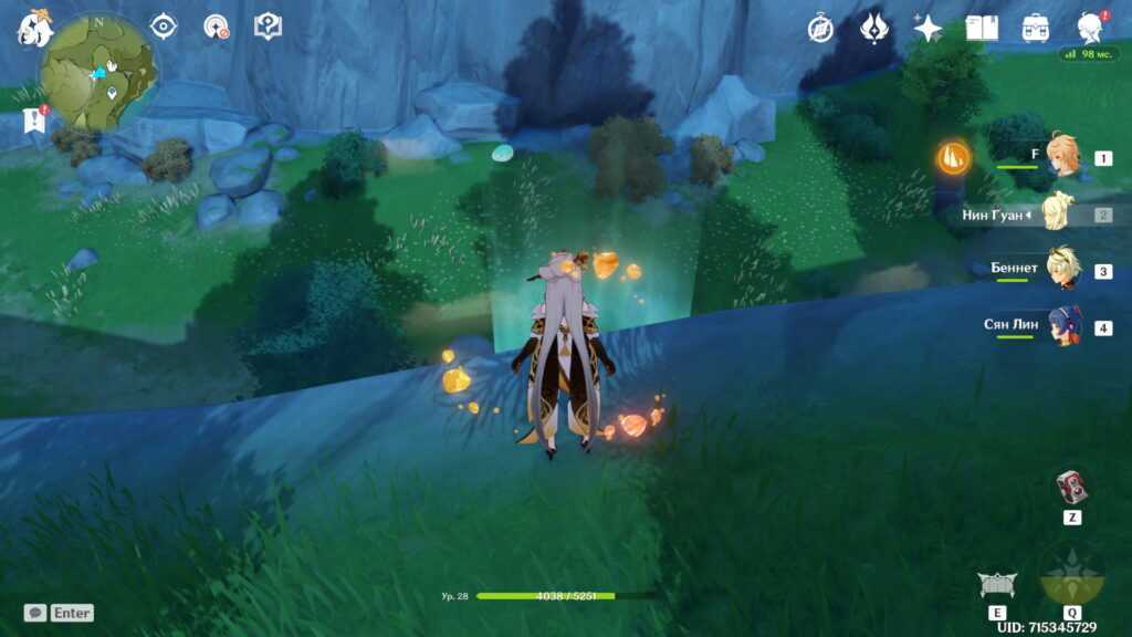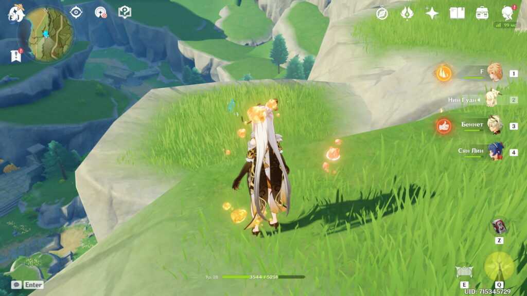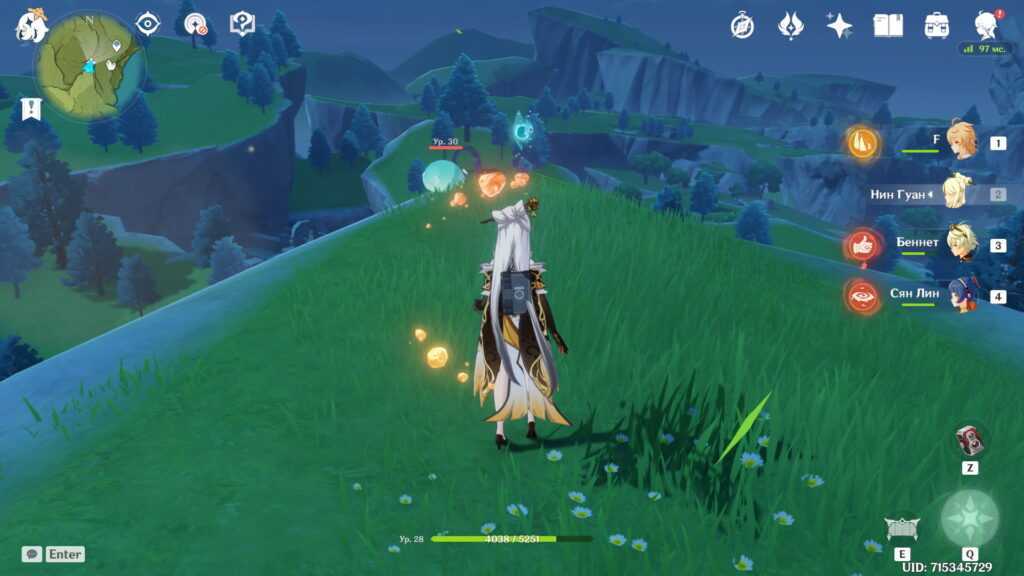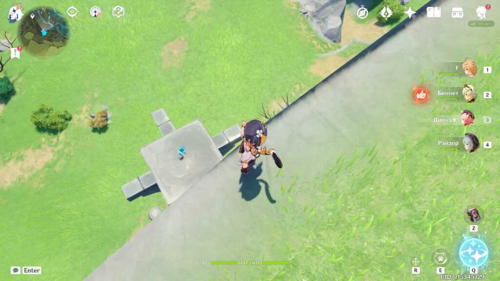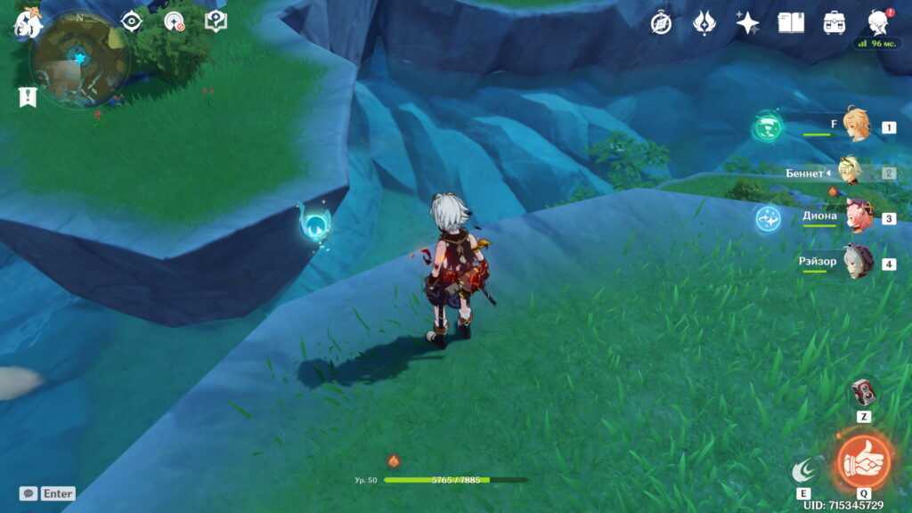 7. Подойдите к краю обрыва, и вы легко заметите парящий в воздухе анемокулус. Используйте навык Anemo на одном из Anemograna (маленьких сверкающих существ в траве), чтобы создать поток ветра. Двойное пространство, чтобы взлететь и схватить анемокулус.