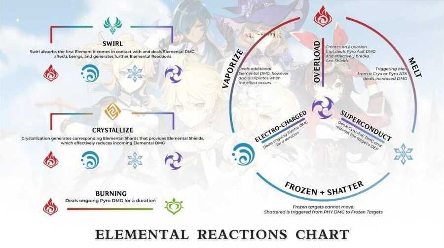 Мы предлагаем на практике проверить, как работают все комбинации элементов в Genshin Impact, выбрать самые оптимальные и уже на их основании подобрать нужные персонажей с нужными стихиями в команде. Кроме того не забывайте, что все эффекты и дебафы от элементальной реакции работают и против вас, поэтому при сражении с противниками учитывайте окружающие условия и типы атак противников.