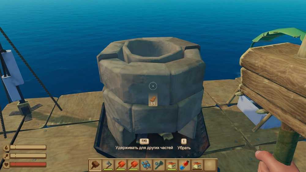 Если вдруг вы отразили атаку акулы, но ваш плот поврежден, то благодаря тому же строительному молоту вы можете частично отремонтировать фундамент. Стоимость ремонта 1 деревяшка за 25% ремонта.