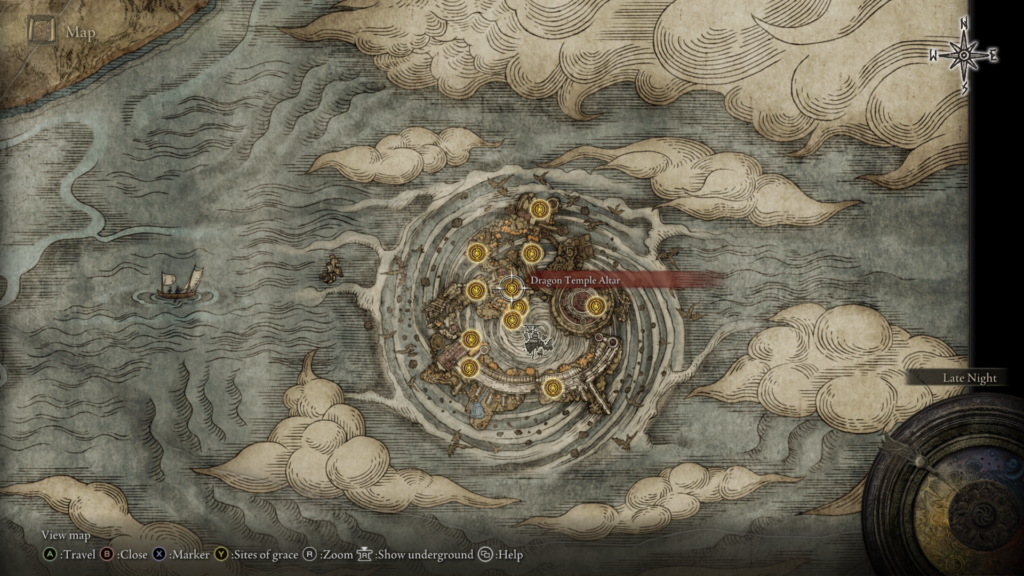 На юго-восточном конце Лимгрейва, недалеко от моста, соединяющего с Плачущим полуостровом. Самый простой способ добраться до него — отправиться на юго-восток прямо от южного участка благодати на озере Агхил, он будет на вершине утеса в виде круглого объекта.