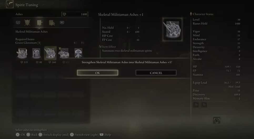 Поговорите с Родерикой, чтобы улучшить свой прах. Улучшение увеличивает запас здоровья духов (в некоторых случаях — количество призываемых существ), повышает силу атаки и так далее, в зависимости от типа духа. Взамен Родерика просит Могильные ландыши — белые цветы, которые работают по аналогии с Кузнечными камнями для оружия. Могильные ландыши можно найти в любой подземной локации, выполненной в тематике гробницы или кладбища (в первую очередь на ум приходят уже упомянутые катакомбы Цербера).
