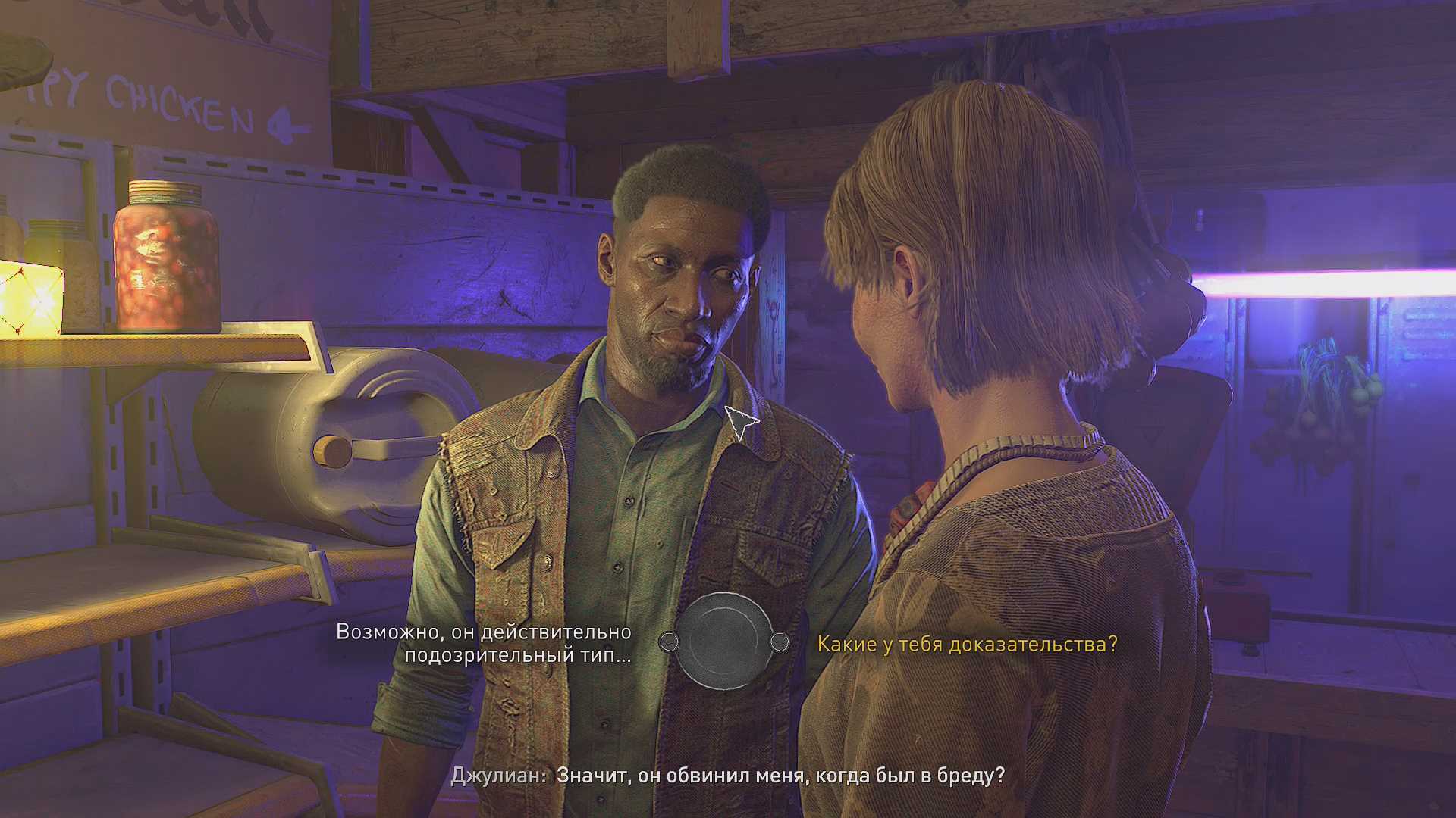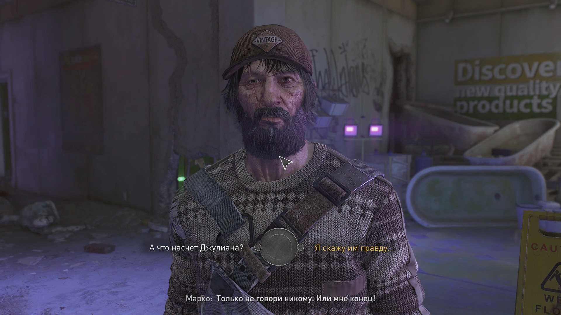 От выбора зависит, как именно герой придёт к очередной своей цели, кто поведёт его через очередной секретный тоннель. Я один раз прошёл игру полностью и второй раз — наполовину, принимая другие решения. И должен сказать, что самые важные сюжетные эпизоды произошли вне зависимости от того, что я говорил и делал. Например, в какой-то момент капитан миротворцев попросит героя расследовать смерть их командира — и герой это сделает. Даже если решил помогать выжившим, даже если прямо скажет капитану, что вертел его и помогать миротворцам не будет.
