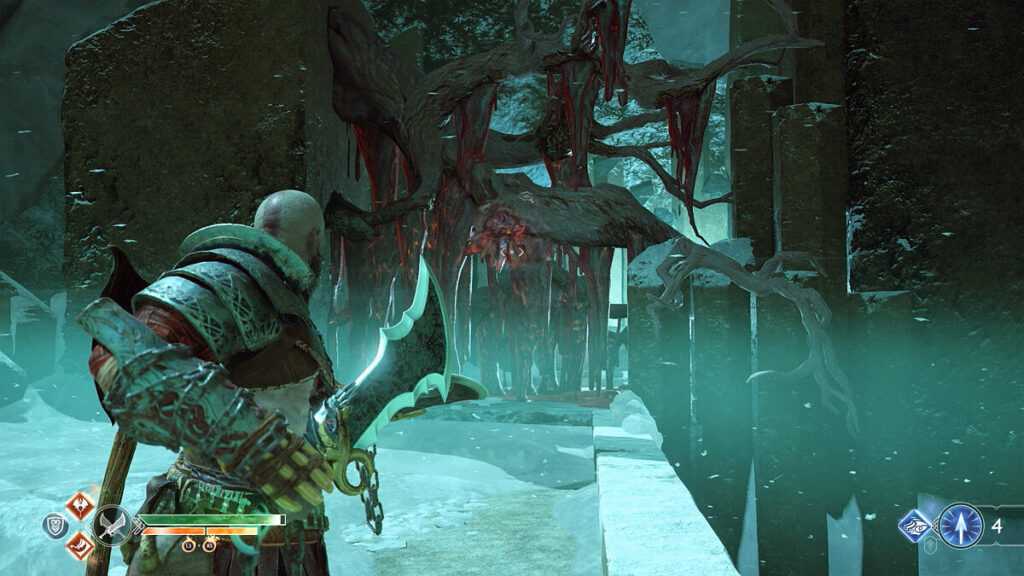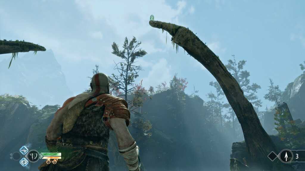Пройдите по мосту Проклятых, затем через пещеру и выйдите на каменный мост. С правой стороны будет красная смола, которую может уничтожить Атрей. Прямо за ней будет следующий ворон.