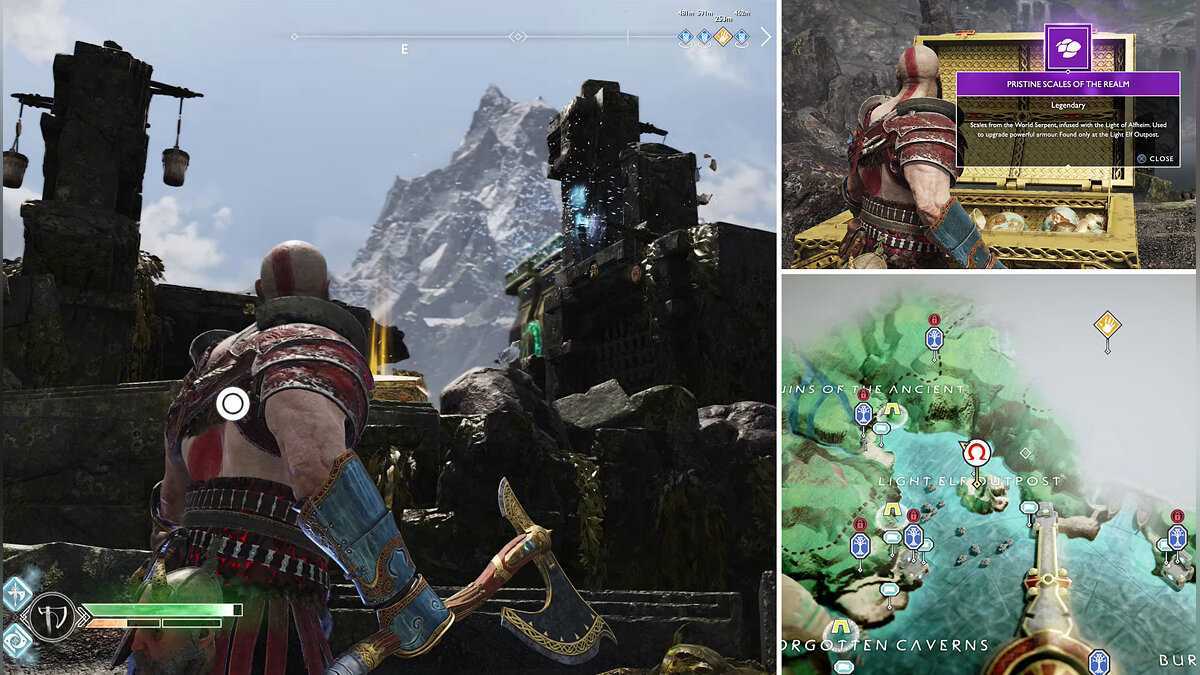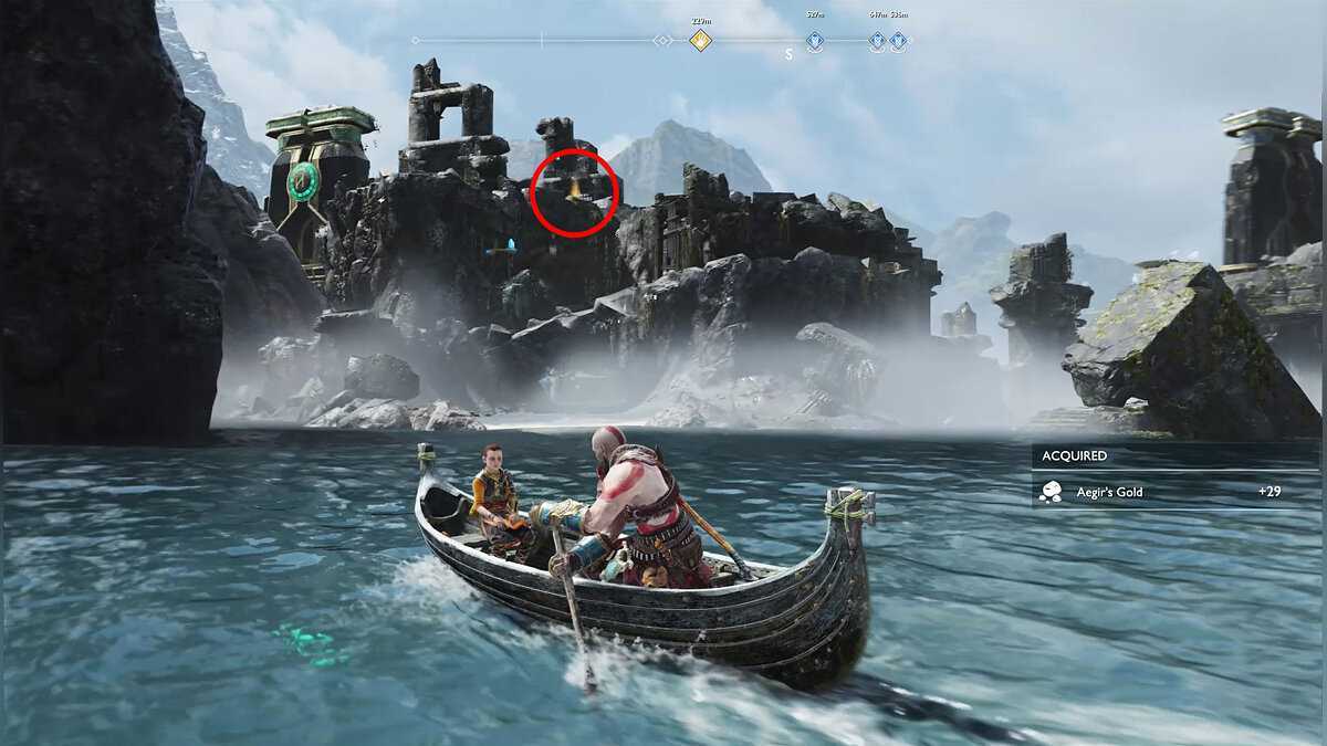 Поднимайтесь и поднимайтесь, преодолевая склоны и обрывы, пока кратос не подойдет к канатной дороге и не опустится на плато. На этом же плато находится святилище, справа от которого зарыто сокровище, почти на краю Вселенной.