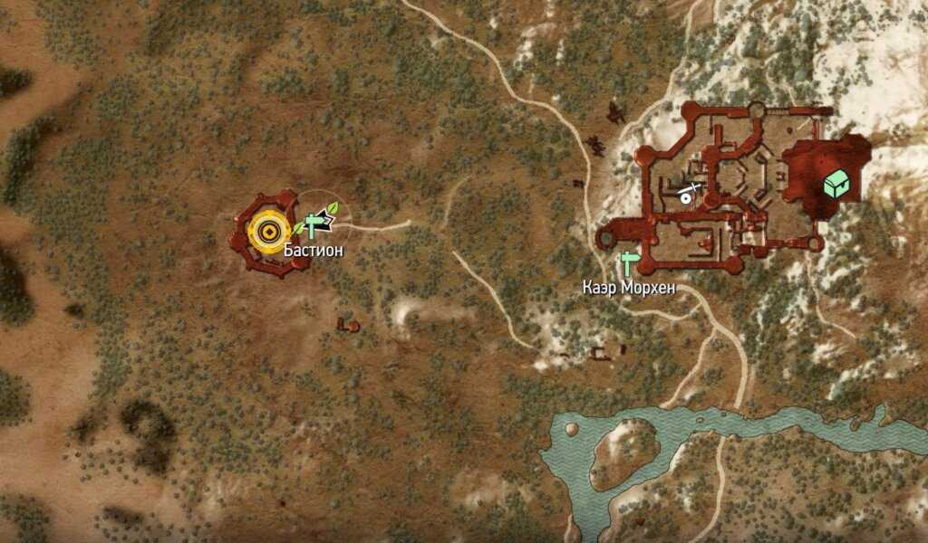 Бастион расположен к западу от крепости Каэр Морхен. Отбиваемся от нескольких призраков 23 уровня, заходим через правые ворота и идем прямо. Среди деревянных обломков под лестницей находим останки, с которых и забираем чертеж стального меча Школы Волка.