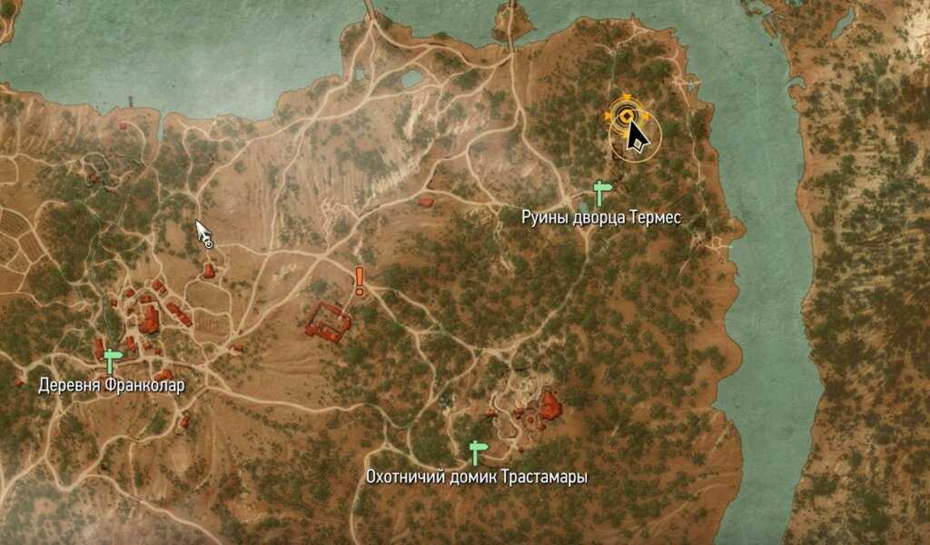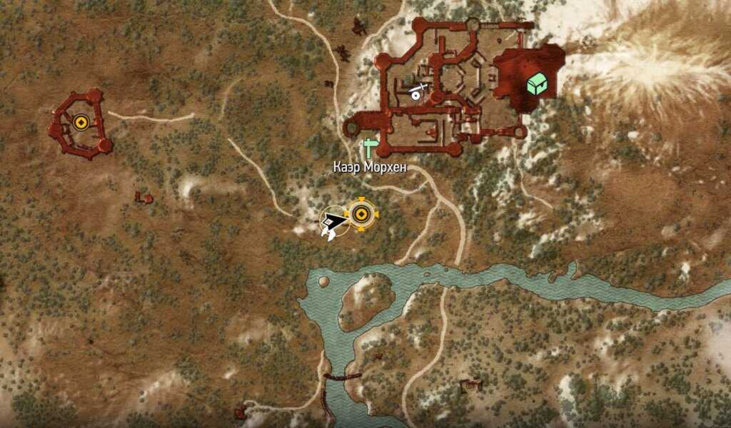 К югу от крепости Каэр Морхен находим горную пещеру: в месте, где заканчивается видимая на карте дорога, нужно повернуть налево и немного пройти по уступу. В пещере обнаруживаем сундук с чертежом улучшенных перчаток Школы Волка.