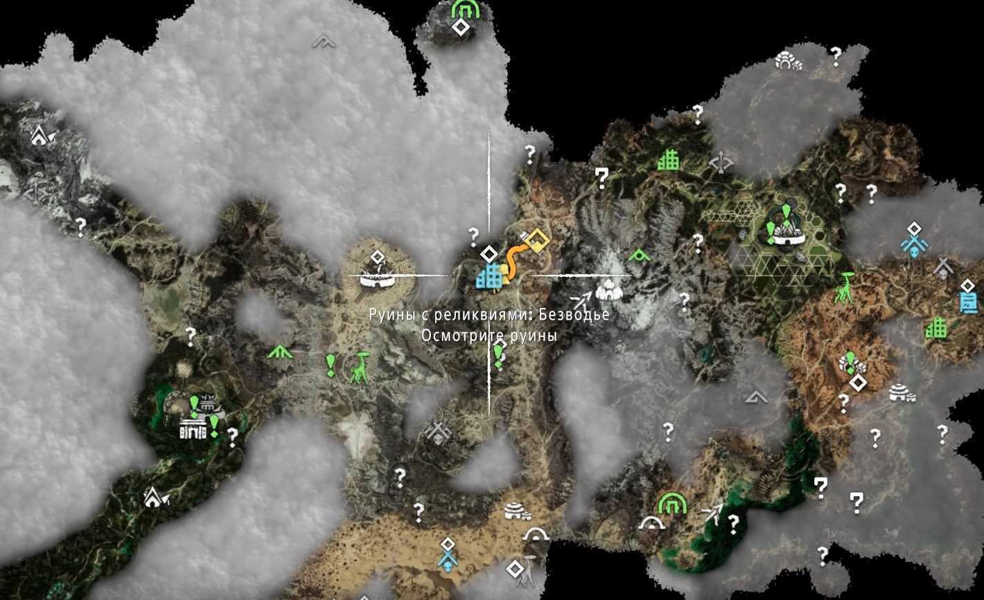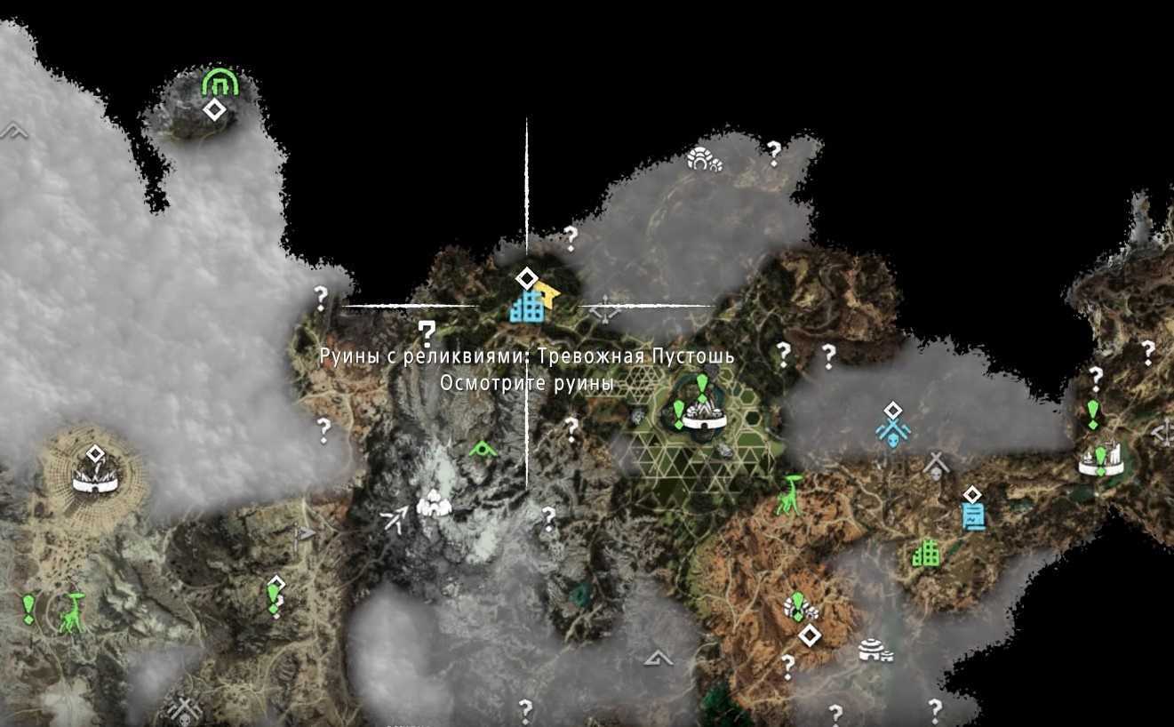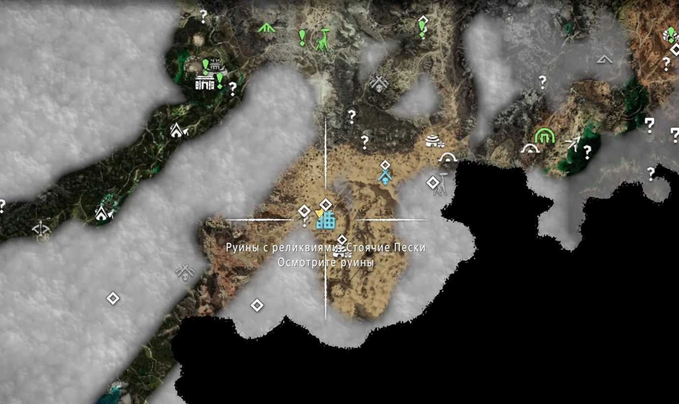 Персонаж отправит Элой в сюжетную локацию. Направляйтесь по метке задания и найдете руины. В этом вам поможет карта. Вас встретит закрытая дверь, для которой нужен код из двух записок.