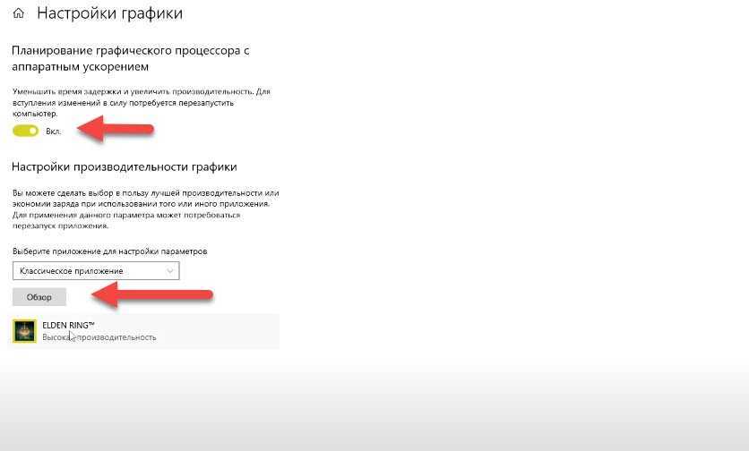 В параметрах включаем «Планирование графического процессора …», а ниже нажимаем на обзор и вводим в поиске eldenring, выбираем файл игры (примерно весит 78мб) и жмем Добавить.