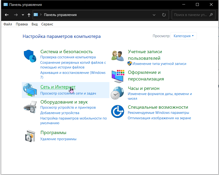 3) Нажмите Сеть и Интернет. (Примечание: убедитесь, что вы просматриваете Панель управления по категориям.)