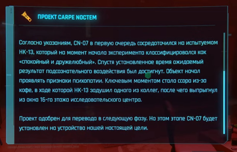На модуле памяти Сандры находятся данные о проекте «Carpe Noctem» для внутреннего пользования копрорации «Найт». Если коротко, то это тесты ИИ Carpe Noctem-07 – он каким-то образом повлиял на подсознание испытуемого, и тот взбесился. Подопытный задушил коллегу и выпрыгнул из окна. Но в корпорации «Найт» считают, что это успех, и отчет заканчивается словами о том, что ИИ можно подселять на устройства настоящей цели. Имя этой цели не указано, но это, скорее всего, может быть Джефф Пералес.