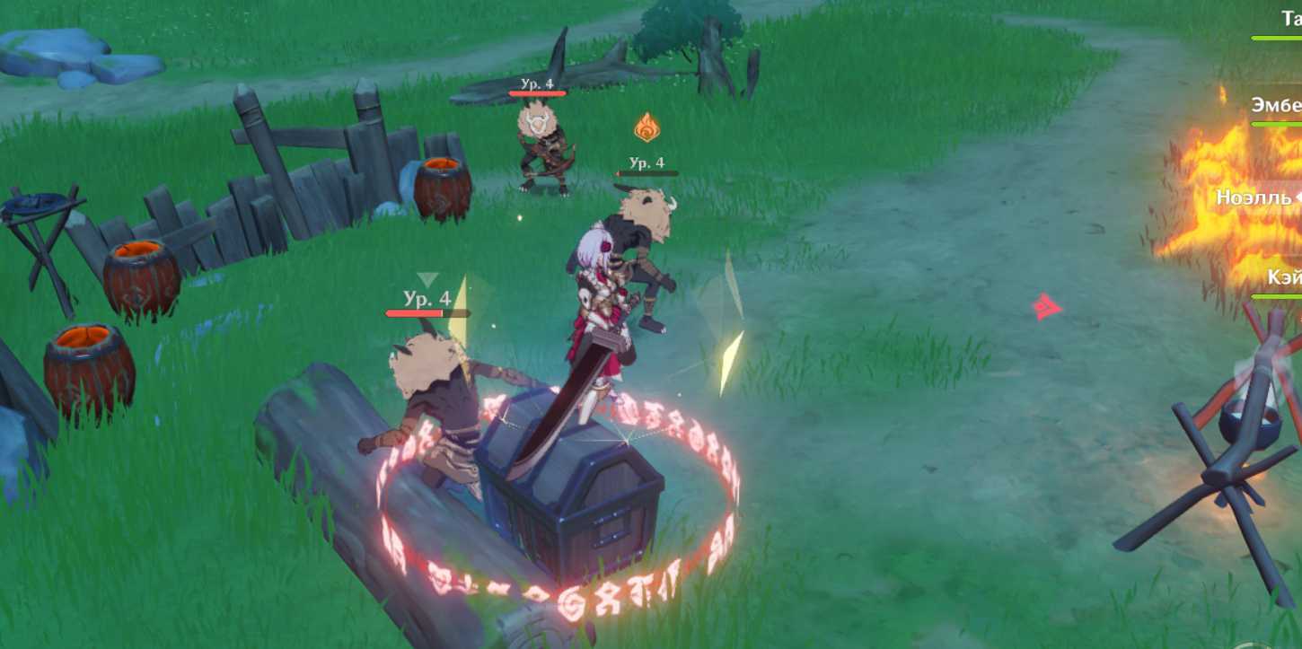 В первом месте нужно уничтожить группу Фатуи, они на возвышении , на дороге за большой статуей. В этой компании есть толстый крио-бомбардир Фатуи, обязательно возьмите для него пиро персонажа.