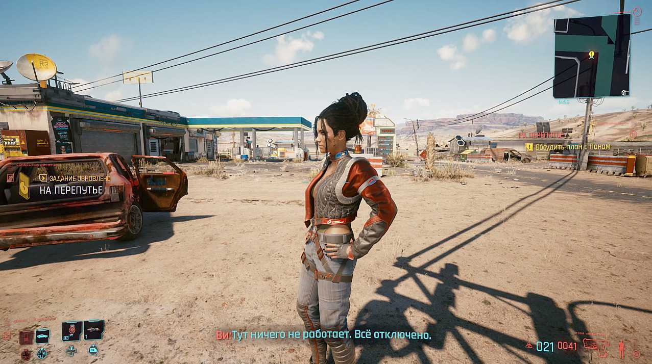 После лагеря вы отправитель в заброшенный город Роки-Ридж, чтобы устроить засаду бандитам, укравшим груз. Девушка попросит просканировать хоть что-нибудь, подключенное к сети — но город вымер, типичный случай для киберпанка. Просканируйте три любых вещи, чтобы продолжить.