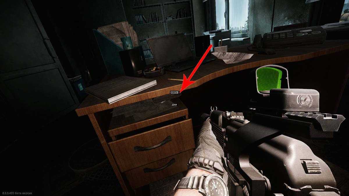 На первый взгляд, квест не сложный, но есть несколько моментов, которые могут поломать цепочку и придется проходить заново один и тот же этап. Задание делится на два рейда по разным локациям. Для начала, нам необходимо на локации с помощью ключа от офисов таможни пробраться на второй этаж здания таможни и выломать дверь директора. У него на полочке в столе рабочего места находится та самая папка с документами. Место папки обозначено на скриншоте ниже. Чтобы продолжить квест, вам с этой папкой необходимо выйти живым с локации. Если сбежать с локации не удастся, то придется заново пробираться за папкой.