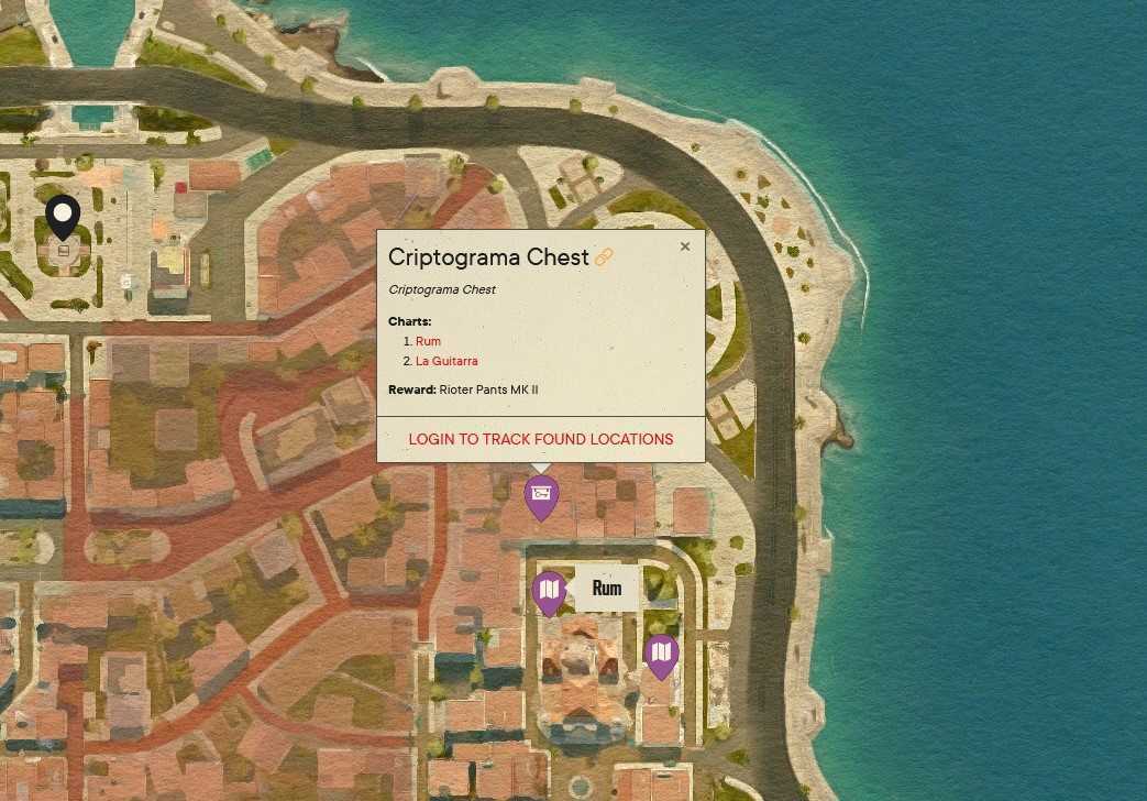 В районе Агуас Линдас идите на север от Убежища Иды к пристани. На балконах одного из этих зданий будет сундук, но первая карта находится на острове прямо на севере. Когда доберетесь туда, оставайтесь на южной стороне острова и поищите на утесе большую синюю ткань, указывающую местоположение карты. Второй находится под волнами, но также отмечен синей тканью, свисающей с деревянных столбов, торчащих из воды. Вы можете найти его к востоку от первой карты. Нырните как можно глубже к самому глубокому куску дерева, который сможете найти, чтобы схватить прибитую к нему диаграмму. В этом сундуке Criptograma есть жилет Rioter Vest MK II, который также усиливает вашу бронебойную защиту, а также устойчивость к взрывам.