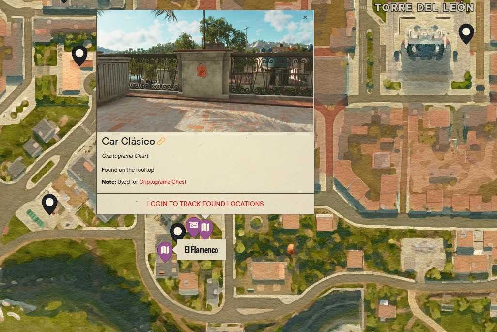 Криптографические чарты: #08 Car Clásico & #15 El FlamencoИспользуйте захватный крюк слева от сундука, чтобы забраться наверх. Затем перепрыгните на следующую крышу справа, чтобы получить первую карту. Оттуда с помощью зиплайна переберитесь на другое здание и, приземлившись, поднимитесь по цветам/лианам, чтобы найти вторую таблицу на вершине.