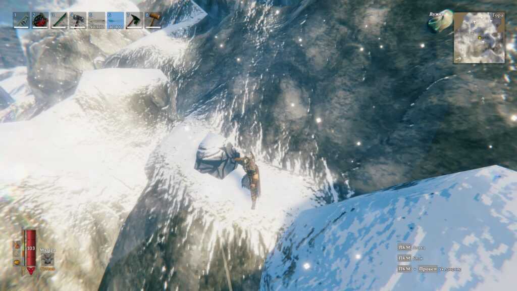 Без соответствующей защиты на Горе персонаж будет получить урон от холода. На первых порах можно использовать медовуху сопротивления морозу, а далее скрафтить волчий нагрудник или же плащ из шкуры волка / быкоящера. При наличии одного из этих предметов медовуха не потребуется.