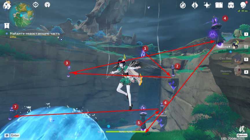 | 5 | Используйте свое элементарное зрение, чтобы наметить волшебные тропы, ведущие к скоплению ветра. Используйте способность элемента Анемо рассеивать сгустки ветра. Примечание: в описании квеста сказано, что скоплений ветра всего 3, а на самом деле их четыре. Чтобы узнать, сколько сгустков вам еще нужно рассеять, воспользуйтесь своим элементарным зрением и изучите свои часы. Внизу устройства есть световые элементы. Укажите, сколько сгустков вы еще не рассеяли. |