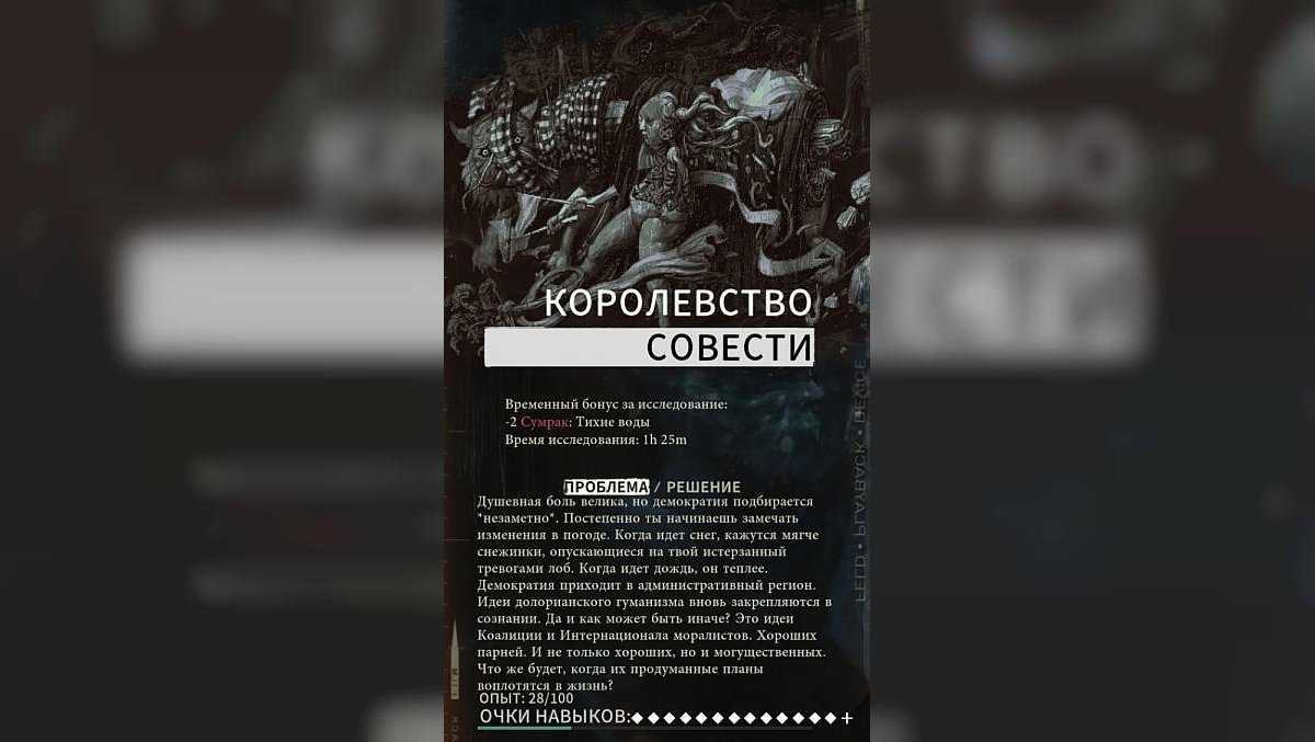 Как получить: необходимо пройти проверку внутренней империи при разговоре с Мананой у забастовки после вопроса об имени героя и предварительно пообщаться с Эвраром.Время исследования: 6 часов 30 минут.Бонус после исследования: