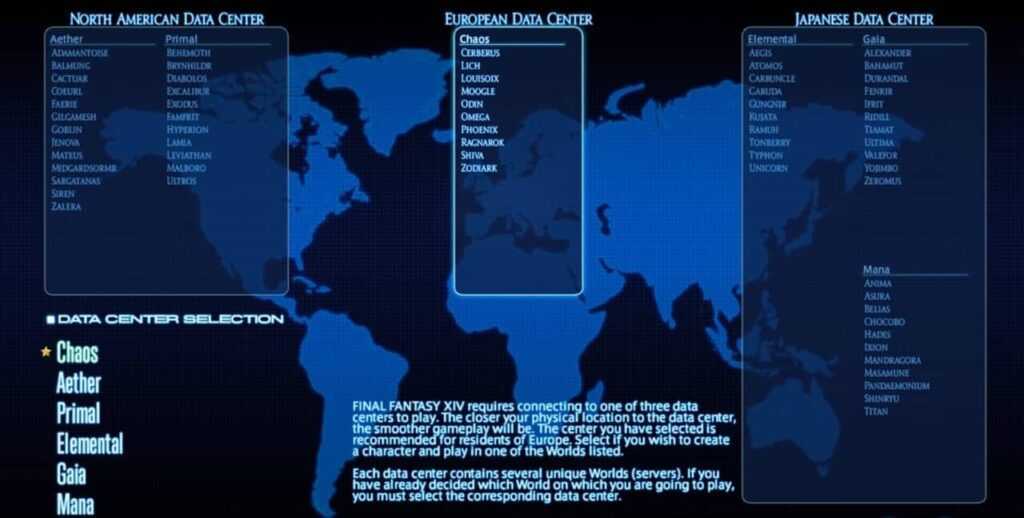 Сервера в Final Fantasy XIV объединены в дата-центры, которые находятся в разных регионах. Одна часть – в Северной Америке, другая часть – в Европе, а также в Японии. Так как в игре нет региональных ограничений, вы можете выбрать любой сервер на любом дата-центре и создать там персонажа.