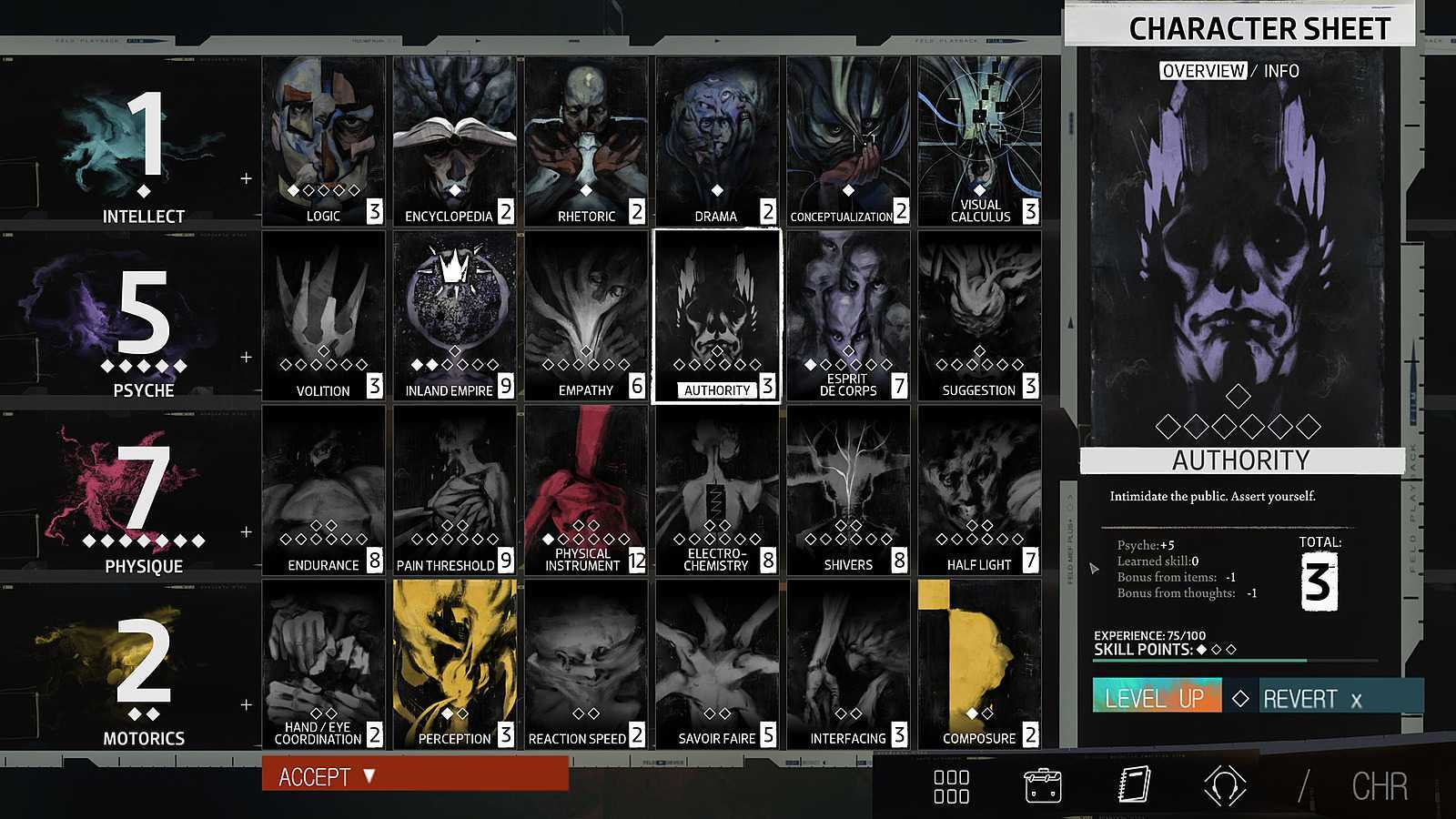 Disco Elysium — неожиданный успех эстонских разработчиков, которые сделали RPG на основе… своей собственной ролевой системы «для посиделок с друзьями». Игра вышла в 2019 году и стала по-настоящему прорывной. Здесь полностью переосмыслен подход к умениям. Есть понятные логика и эмпатия, а есть совершенно загадочные, вроде Savoir Faire (условно: «обстоятельность»). Смысл подобных «навыков» сложно даже объяснить в одном предложении. Атрибут Electrochemistry, например, ответственен за тягу персонажа к удовольствиям жизни, таким как наркотики и секс, но он же поможет разглядеть признаки наркотического отравления у встреченного NPC.