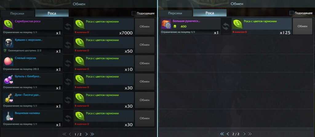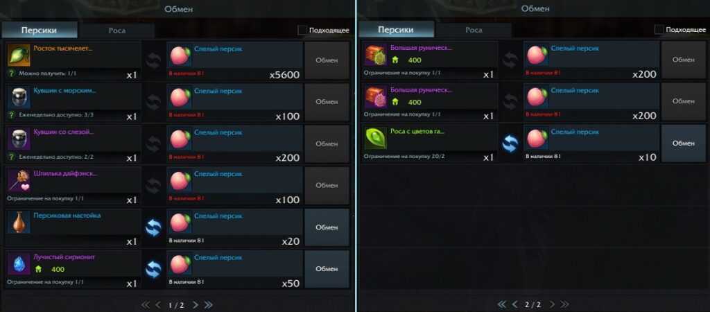 Персиковая настойка, фиолетовый подарок для репутации, кувшины со слезой Гивэны и Морскими изумрудами (нужны для покупок на острове Афарес), лучистый сирионит, шкатулки с рунами и «Росток тысячелетнего дерева» (предмет для получения души Персикового острова). Также на этой вкладке можно обменять персики на «Росу с цветков гармонии», но не более 20 шт. росы в сутки.