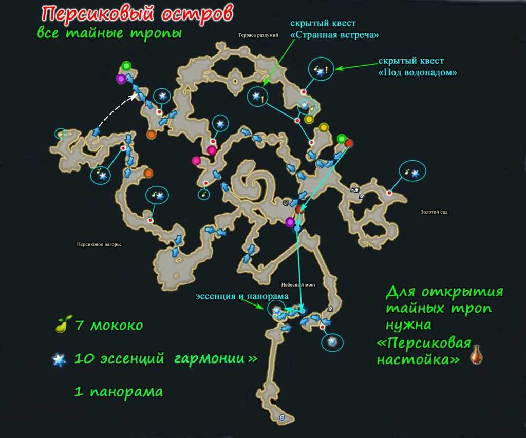 Задание находится в скрытом месте, куда нужно добраться из желтой «транспортной» точки. Внутри тайный ход раздваивается, боковая дорожка ведет к мококо и эссенции, а если пройти прямо и перепрыгнуть реку, можно открыть (с помощью персиковой настойки) секретную локацию с озером и грустной пандой.